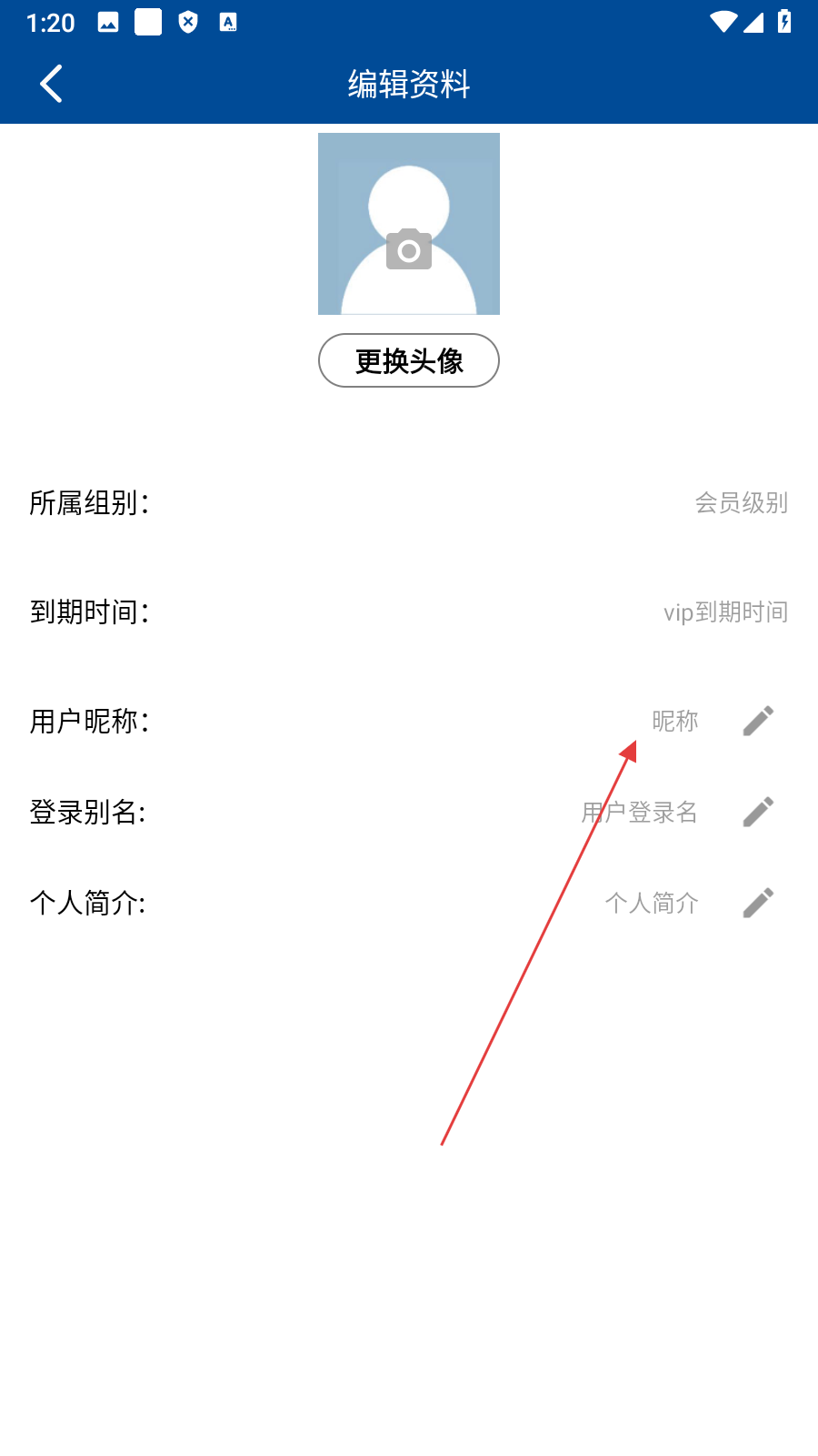3、在编辑资料页面,点击【用户昵称】对应的编辑图标,进入昵称编辑界面。