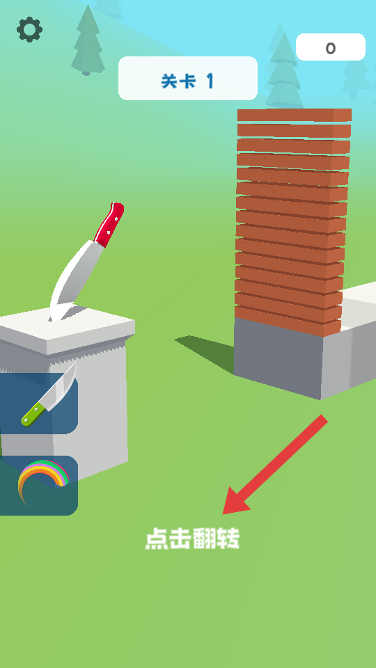 1、进入【关卡-1】后,看到界面提示,点击【点击翻转】按钮,让刀开始翻转移动。