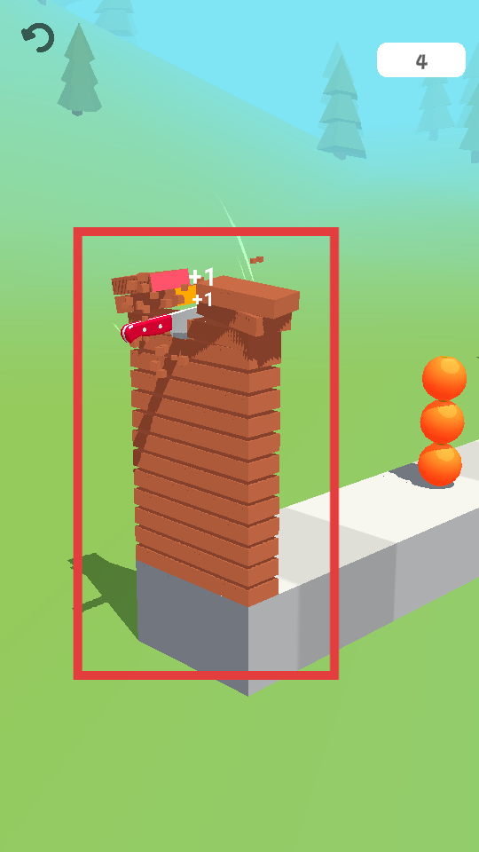 2、把握好时机,使翻转的刀插入红框内的木块堆叠体中,每成功插入可获得分数。