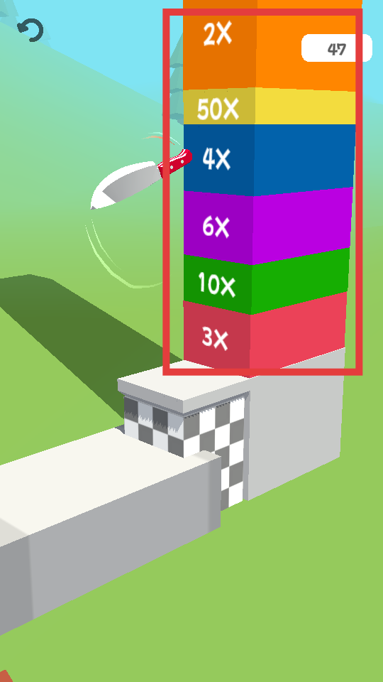 3、后续木块堆叠体会出现带有【2X】【50X】等倍数标识的层,插入刀时尽量击中高倍数层来获取更高分数。