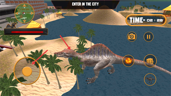 3、用左侧虚拟摇杆操控恐龙移动,准备进入城市。