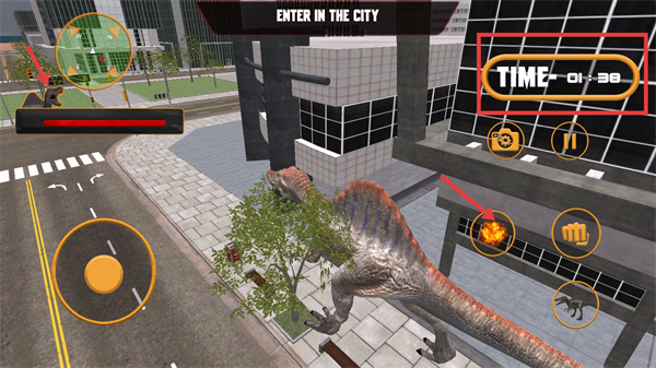 4、在规定时间内,操控恐龙进入城市,完成关卡任务,遇到敌人可以使用右下角技能进行攻击。