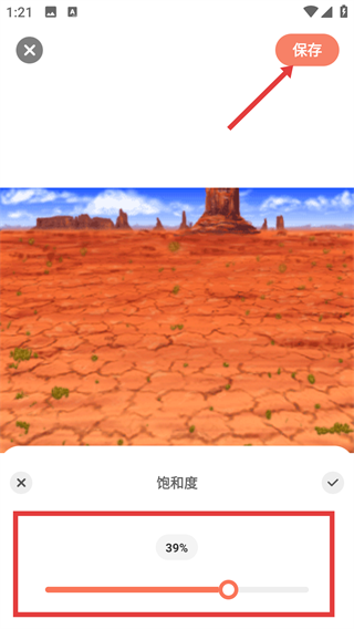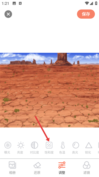 4、调节好饱和度等参数后,点击界面右上角的【保存】按钮,完成图片编辑操作。
