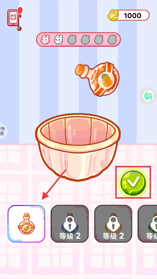2、选择【等级1】果汁食材,点击绿色对勾,将食材加入容器,推进果冻制作。