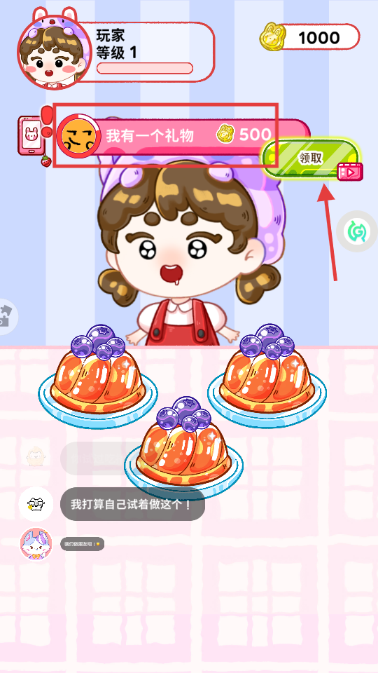 4、出现【我有一个礼物】提示时,点击【领取】(看广告),获取500金币奖励。