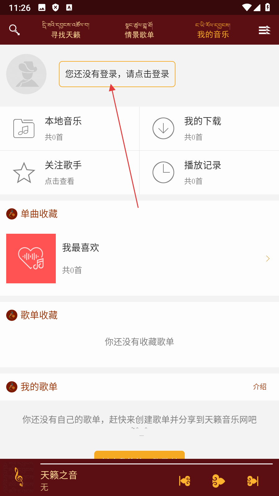 2、在个人音乐页面,点击【您还没有登录,请点击登录】,进入登录界面。