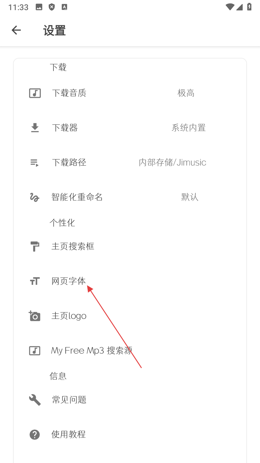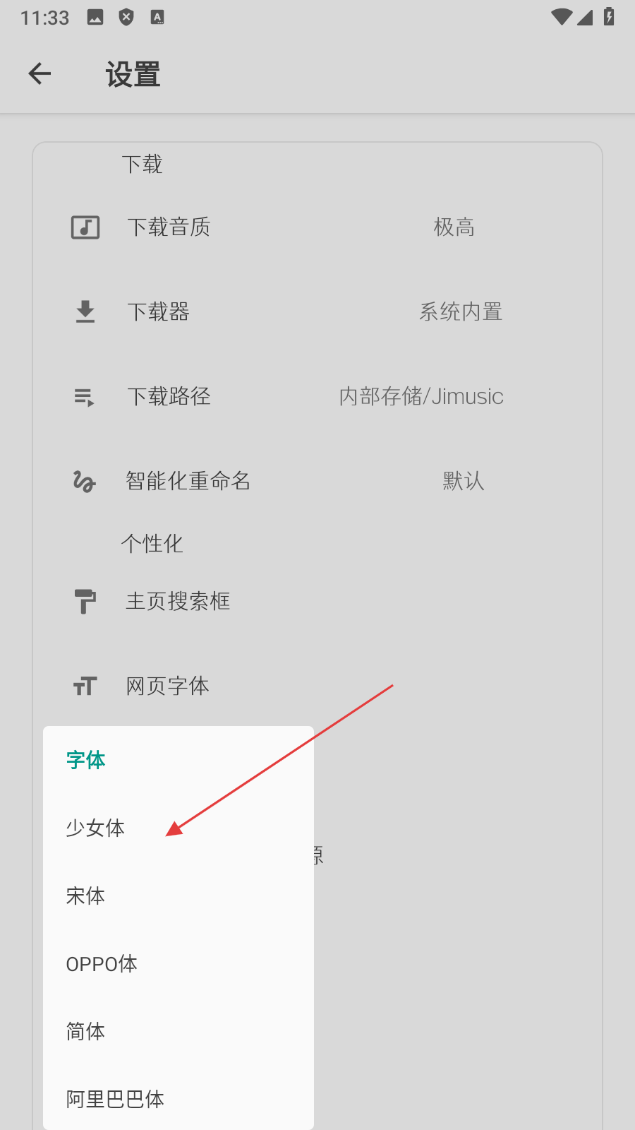 3、在设置页面,点击【网页字体】,弹出字体选择的列表。