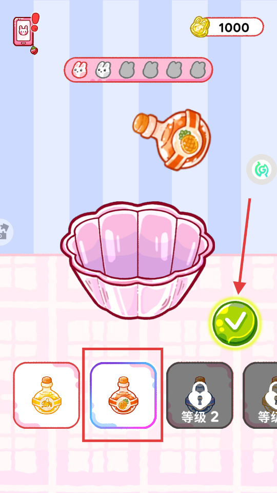 2、选择可用的食材(如【橙色-饮料】),点击绿色【√】按钮确认,推进美食制作环节。