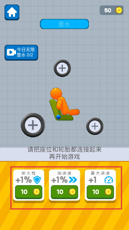 1、按照提示,把座位和轮胎连接起来,也可花费金币提升车辆耐久性、加速度、最大速度属性。