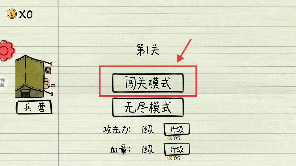 1、进入游戏后选择【闯关模式】开启挑战,可先升级【攻击力】【血量】增强初始战力。