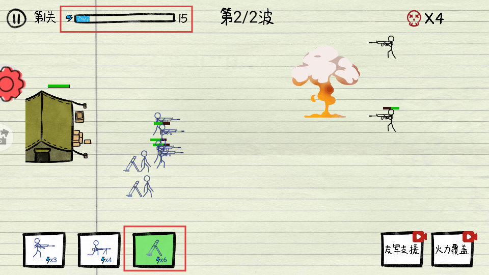 3、关注上方【能量条】,数值增长时点击绿色【x6】兵种,利用AOE爆炸高效清理敌人。