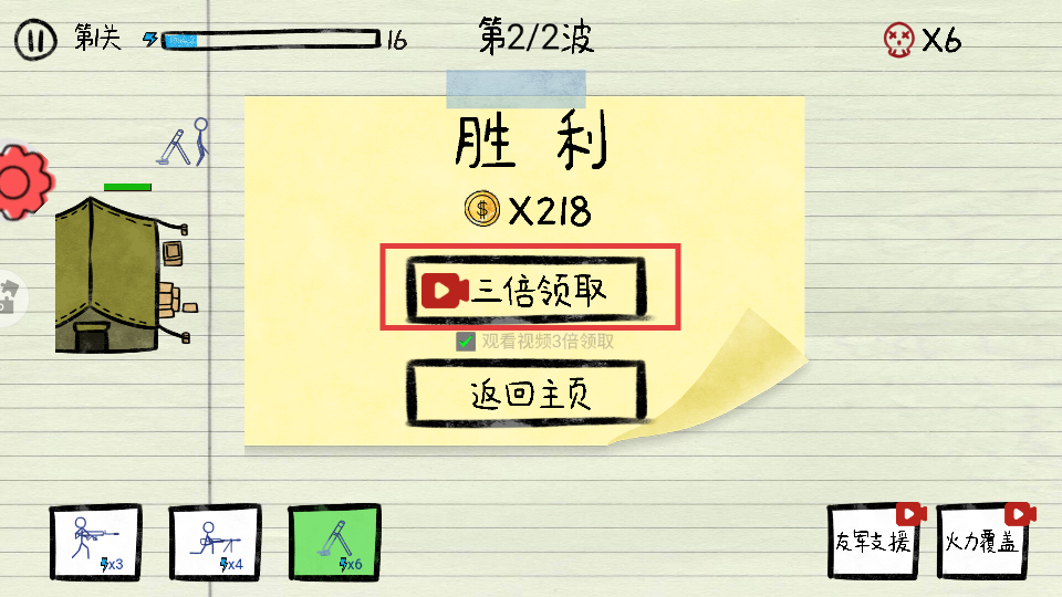 4、关卡胜利后,点击【三倍领取】看广告获【218x3】金币,用于升级提升后续战力。