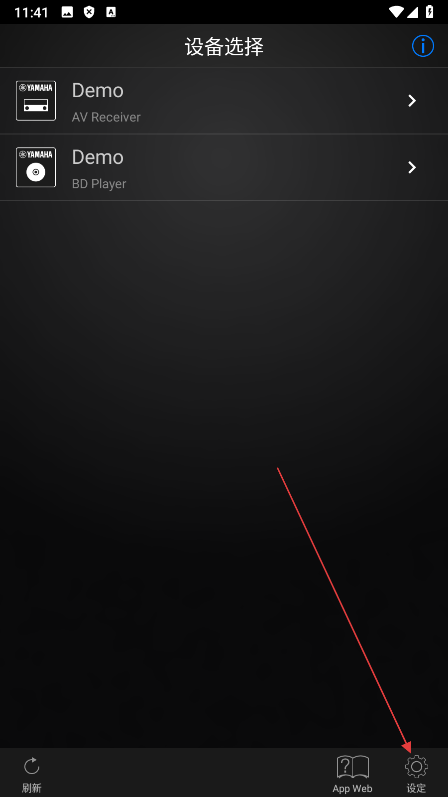1、在设备选择界面,点击右下角【设定】,进入设定选项页面。