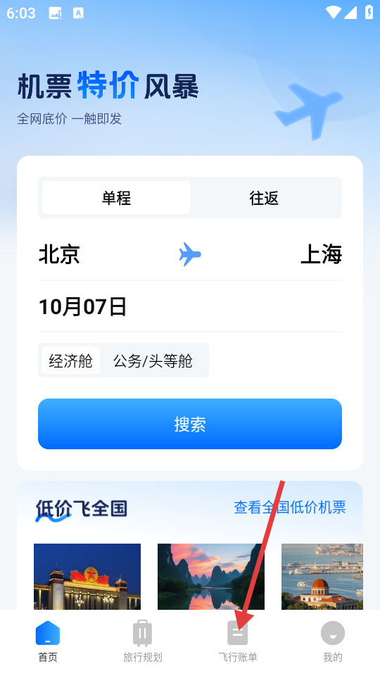 2、进入APP后,点击底部【飞行账单】。