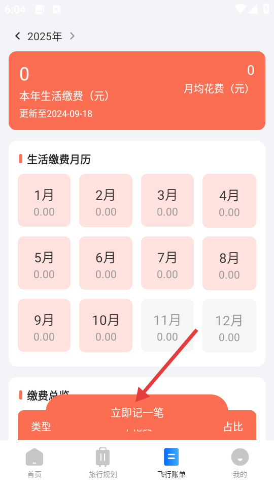 3、进入【飞行账单】页面,可查看生活缴费月历,点击【立即记一笔】。