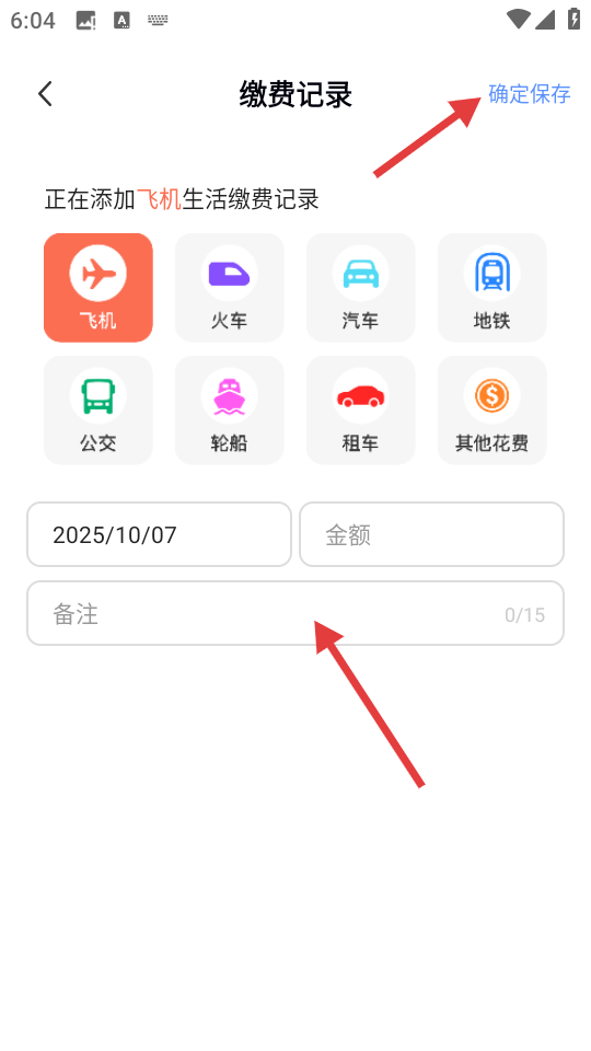 4、在缴费记录页面,选择花费类型,填写日期、金额、备注,点击【确定保存】,记录缴费信息。