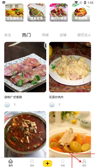 2、进入软件首页,可浏览热门菜谱等内容,点击底部导航栏最右侧的【我的】,进入个人中心页面。