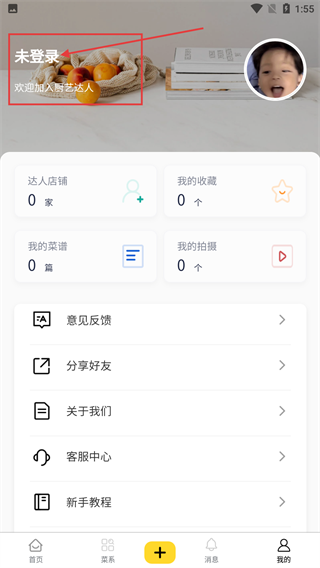 3、在“我的”页面,显示【未登录】状态,若要使用达人店铺、我的收藏等功能,需进行登录操作。