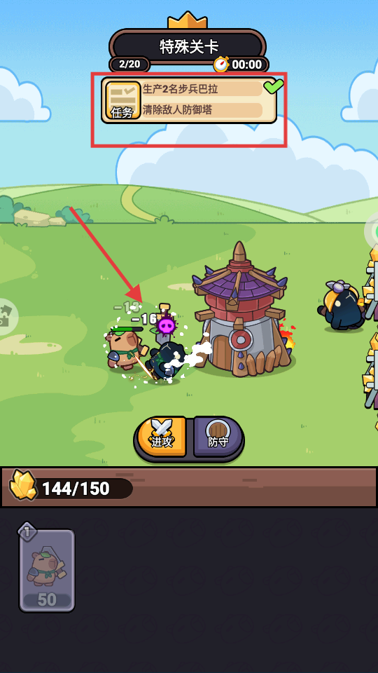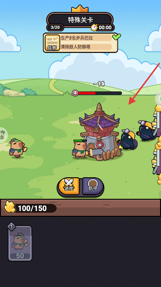 1、拥有足够资源时,点击【步兵巴拉】卡牌(消耗50)召唤,推进【生产2名步兵巴拉-清除敌人防御塔】任务。