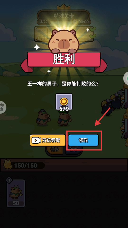 4、关卡胜利后,点击【领取】按钮获取679金币奖励,也可看广告选择【双倍领取】提升收益。