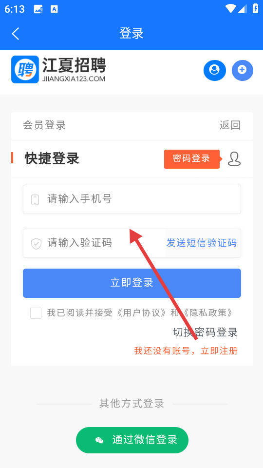 1、进入APP登录页面,可输入手机号、验证码,勾选同意协议后点击【立即登录】。