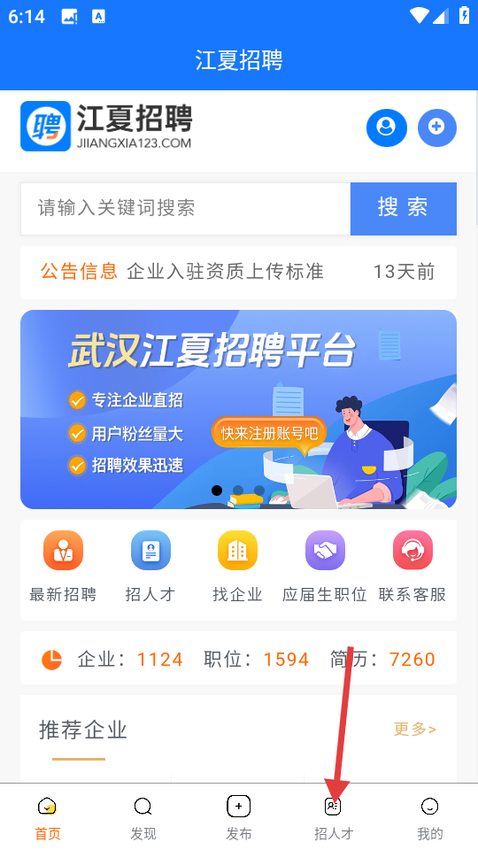 2、进入首页后,点击底部【招人才】。
