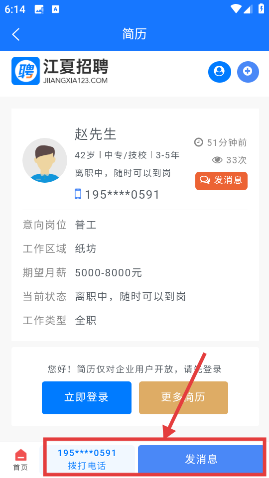 4、进入详情页后,可查看具体信息,也可通过显示的电话拨打或点击【发消息】与求职者联系,进行招聘。