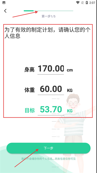 1、进入软件后,确认【身高】【体重】【目标】这些个人信息,点击【下一步】继续。