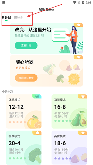 2、在【轻断食now】的【日计划】标签页,可选择查看计划或开启随心断食等模式,开始定制日断食计划。