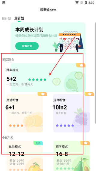 3、切换到【周计划】标签页,可查看本周成长计划,还能选择【经典模式-5+2】等灵活断食模式。
