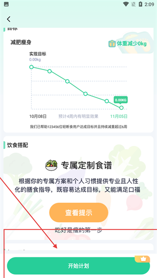 4、查看减肥瘦身目标与专属定制食谱后,点击底部【开始计划】,即可启动专属的饮食计划。
