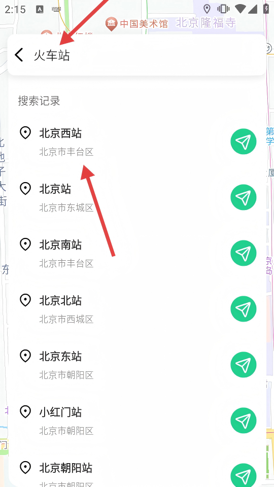 2、在搜索框输入【火车站】,会出现【北京西站】【北京站】等搜索记录,可选择目标站点。