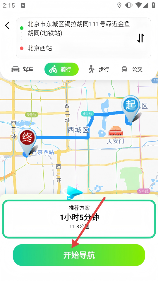 3、选好目的地后,进入骑行路线页,能看到推荐方案时长、距离,点击【开始导航】即可启动导航。