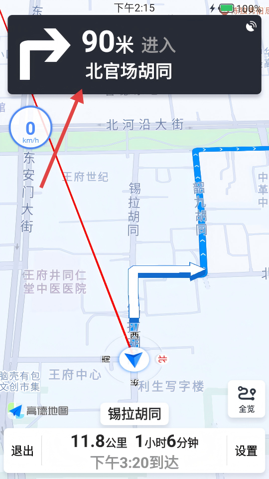 4、导航中会有实时指引,如【90米-进入北官场胡同】,还会显示全程距离、耗时及预计到达时间,跟随指引骑行。