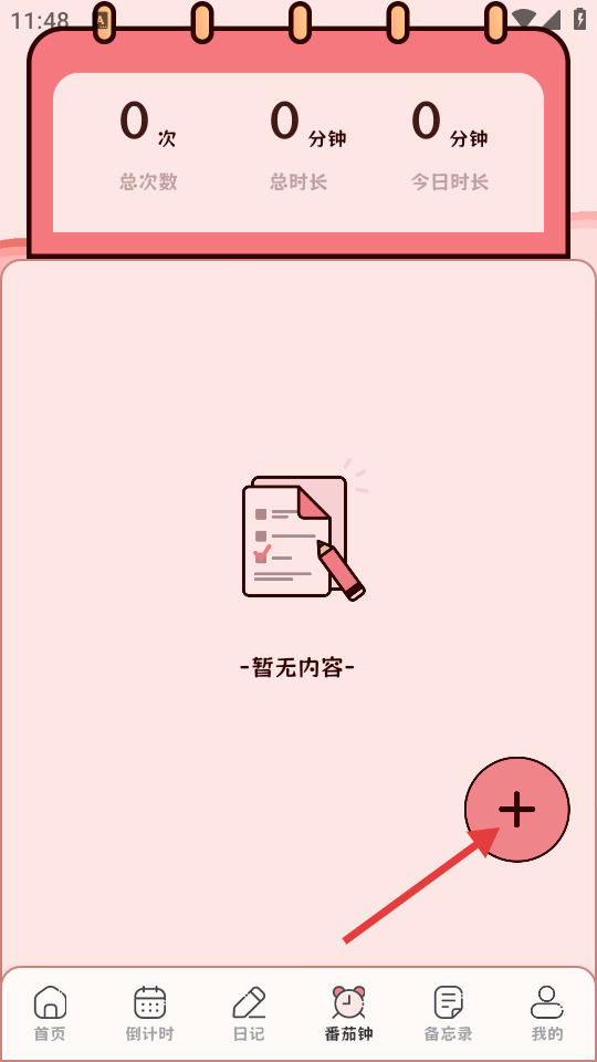 2、进入番茄钟页面,若暂无内容,点击右下角“+”号。