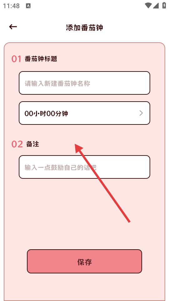 3、在添加番茄钟页面,输入番茄钟标题、设置时长,也可填写备注,然后点击【保存】。