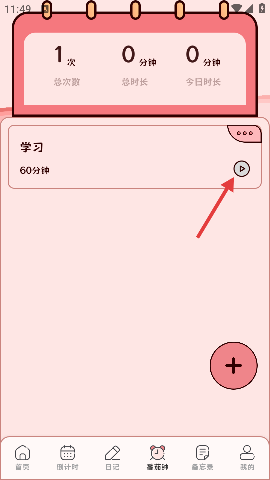 4、保存后,在番茄钟页面可看到添加的番茄钟,点击右侧播放按钮,即可启动番茄钟,进行时间管理。