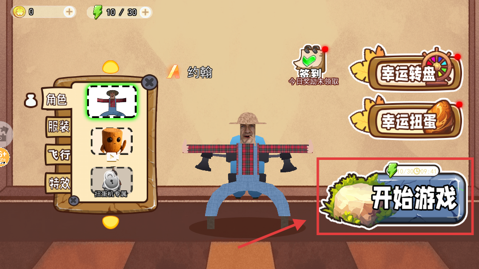 1、点击【开始游戏】进入关卡,选用角色【约翰】,准备开启跑酷挑战。