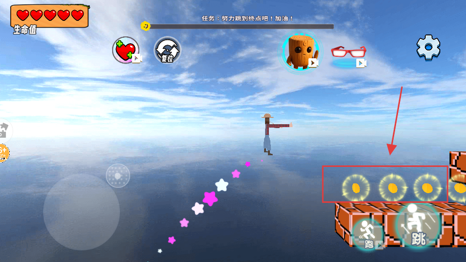 3、跑酷中收集【金币】,用【跑】-【跳】跨越平台,随星星轨迹节奏前进。
