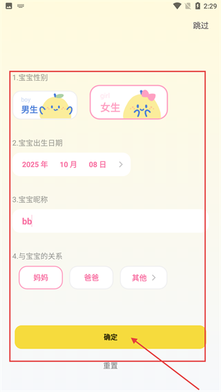 1、填写宝宝性别、出生日期【2025年-10月-08日】、昵称【bb】、与宝宝关系后,点击【确定】完成信息设置。