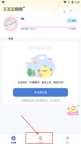 2、进入【宝宝云相册】页面,可点击【立即记录】记录宝宝成长,还能查看云相册容量等信息。