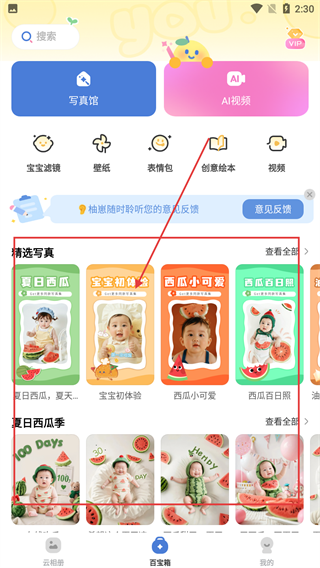 3、在【百宝箱】页面,可选择【写真馆】【AI视频】等功能,也能挑选【夏日西瓜】【宝宝初体验】等精选写真模板。