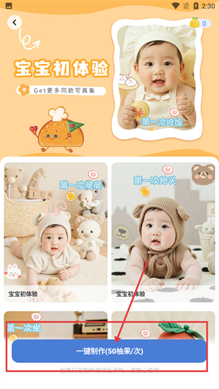 4、进入【宝宝初体验】写真集页面,选择喜欢的宝宝场景模板后,点击【一键制作(50结果/次)】生成写真。