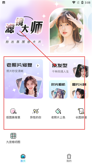 2、进入首页后,能看到【滤镜大师】相关功能区域,选择自己需要的,比如:点击【换发型】选项。