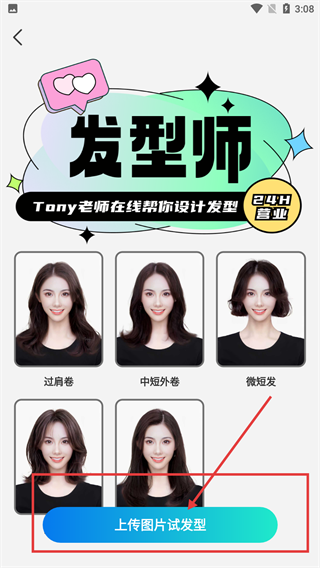 3、在【发型师】页面,可查看【过肩卷】【中短外卷】等发型样式,点击【上传图片试发型】按钮。