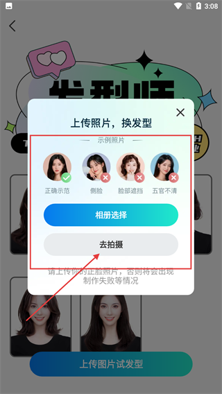 4、弹出【上传照片,换发型】窗口后,可根据需求选择【相册选择】从相册选图,或点击【去拍摄】直接拍摄正脸照片。