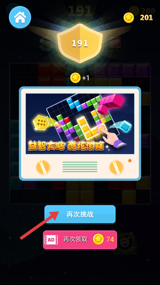 4、游戏结束后,点击【再次挑战】,重新开始游戏,争取更高分数。