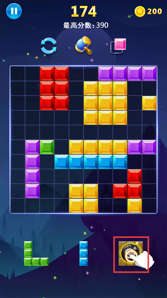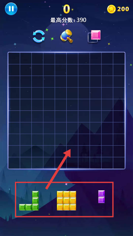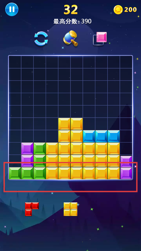 2、合理放置方块,尽量填满网格行,消除方块获取分数。