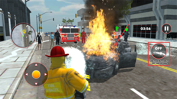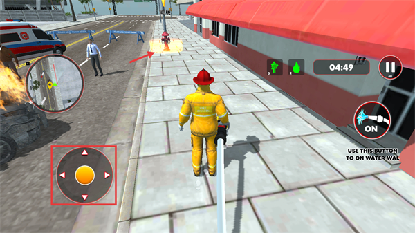 3、到达目的地后,操控消防员走到消防栓旁,准备连接水管,此时用左侧方向轮盘移动,会更灵活哦。