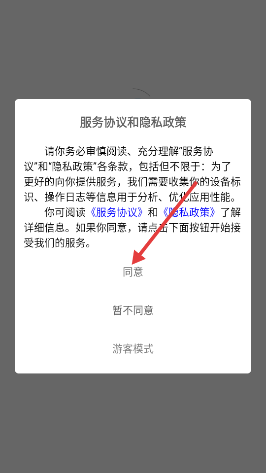 1、阅读【服务协议】和【隐私政策】,点击【同意】,进入APP。
